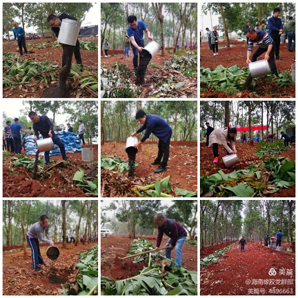 为将结对共建落到实处,第一党支部结合当前基地分公司正在开展胶园冬春管理工作的实际,与丰收队党支部共同商定开展“结对共建同进步 义务献肥促冬管”主题党日活动。在海垦集团党委委员、副总经理,海南橡胶党委书记、董事长艾轶伦等党员带领下,支部党员积极响应号召,自发捐款3400元购买羊粪生物有机肥,并施放到丰收队的橡胶林段,为明年橡胶增产增收贡献绵薄之力。