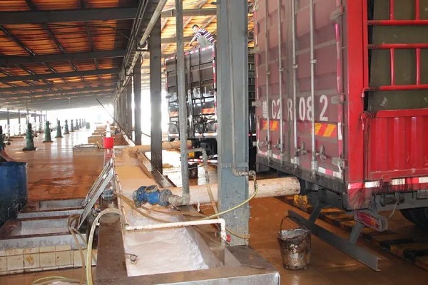 胶水车在金联橡胶加工分公司卸胶水。简日明 摄