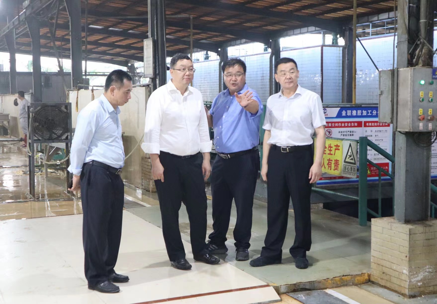 “目前收胶价格是多少,每天能收多少胶?”“污水废气采取什么处理方法?”在金联橡胶加工分公司生产现场,马咏华先后来到缷胶台、澄清池、离心车间、污水处理监控室,听取相关负责人关于橡胶加工年产量、原料收购、生产流程、环保工艺等方面情况汇报。