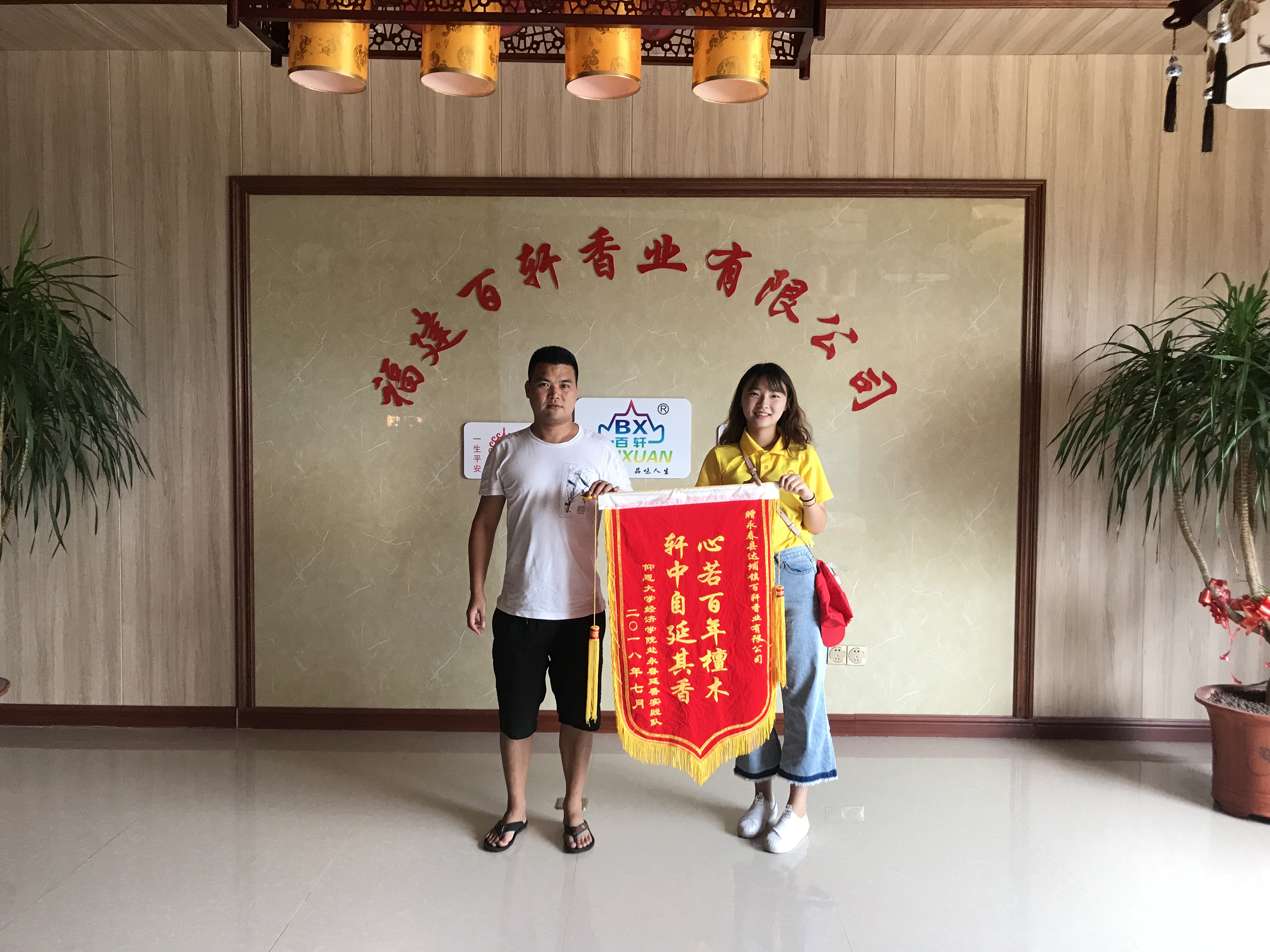 (图为实践队员向百轩香业负责人赠予锦旗)