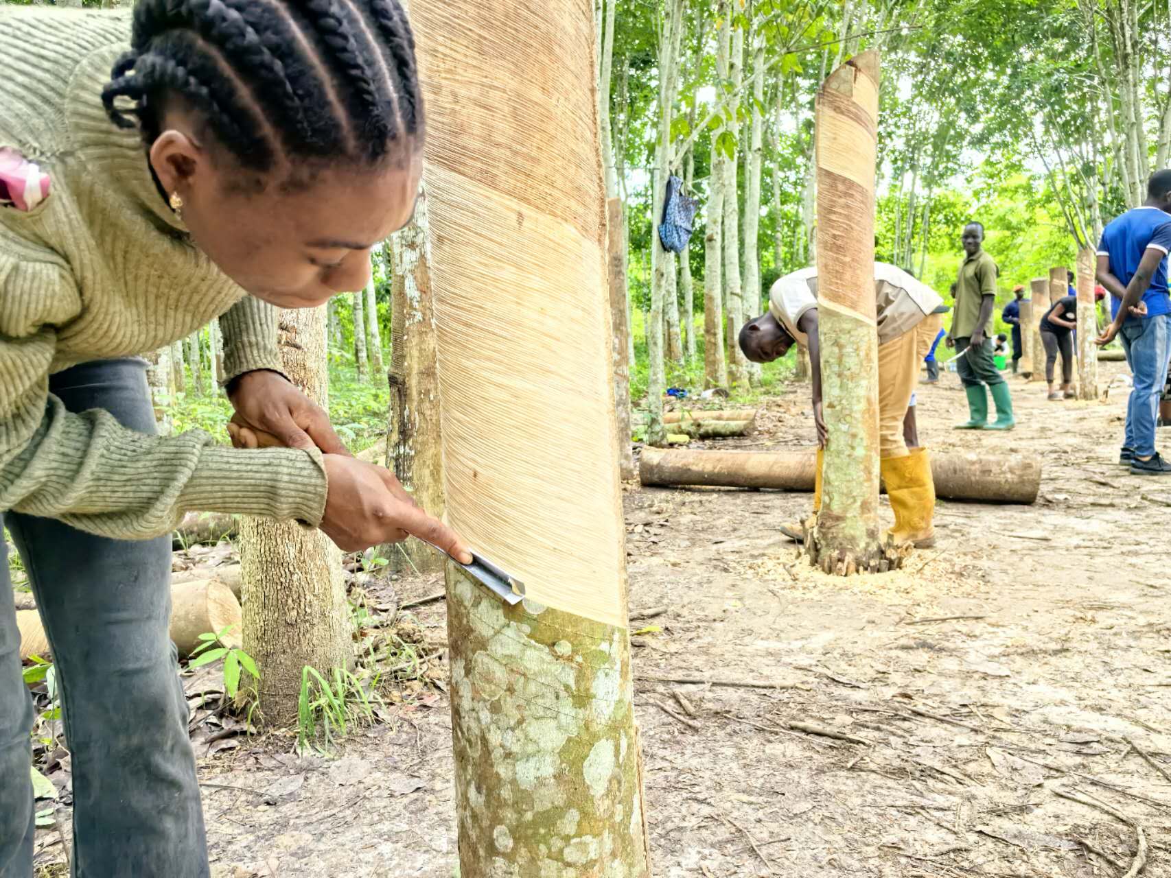 近日,海南橡胶首批赴非专家团在喀麦隆Sudcam和Hevecam两大种植园开展割胶技术培训。自4月1日起,专家们开始教授海南橡胶的推刀技术,经过短短8天时间,参与培训的20名当地胶工已经熟练掌握了低割线与中割线的操作要领与技术,初见培训成效。 专家团成员雷福生向当地胶工演示推刀割胶技巧。