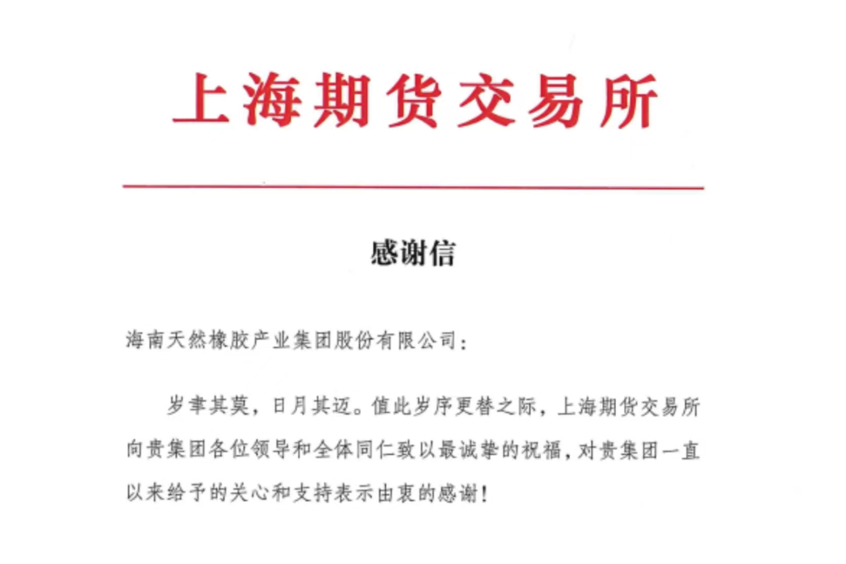 海南橡胶收到上海期货交易所感谢信
